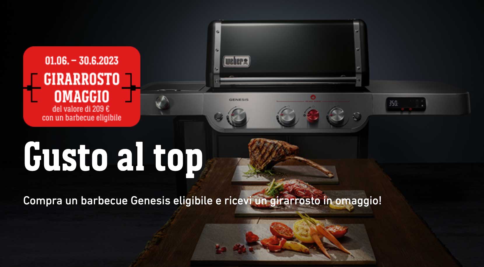 Se acquisti un BBQ a Gas della gamma Genesis entro il 30 giugno 2023, riceverai in omaggio direttamente a casa tua uno splendido Girarrosto Weber.